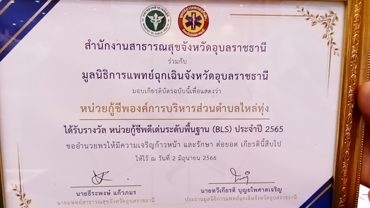 วันที่ 2 มิถุนายน 2566 ร.ต.ต.ผัน ละม่อมสาย รองนายกองค์การบริหารส่วนไหล่ทุ่งพร้อมด้วย เจ้าหน้าที่.กู้ชีพ อบต.ไหล่ทุ่ง เข้ารับรางวัลหน่วยกู้ชีพดีเด่น ระดับพื้นฐาน(BLS) ประจำปี 2565 ณ โรงแรมกิจตรงรีสอร์ท จังหวัดอุบลราชธานี