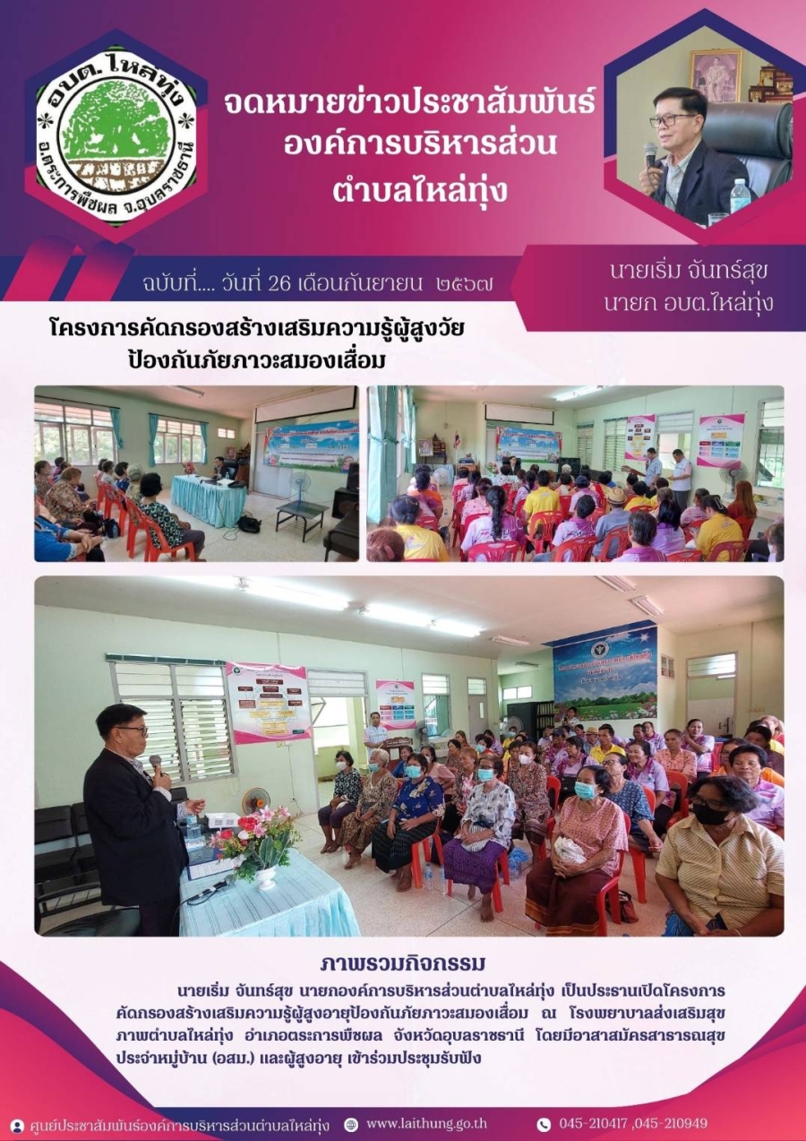 นายเริ่ม จันทร์สุข นายกองค์การบริหารส่วนตำบลไหล่ทุ่ง เป็นประธานเปิดโครงการคัดกรองสร้างเสริมความรู้ผู้สูงวัยป้องกันภัยภาวะสมองเสื่อม ของโรงพยาบาลส่งเสริมสุขภาพตำบลไหล่ทุ่ง ซึ่งเป็นโครงการกองทุนหลักประกันสุขภาพ โดยกลุ่มเป้าหมายคืออาสาสมัครสาธารณสุขประจำหมู่บ้าน (อสม.) และผู้สูงอายุ ในเขตรับผิดชอบโรงพยาบาลส่งเสริมสุขภาพตำบลไหล่ทุ่ง